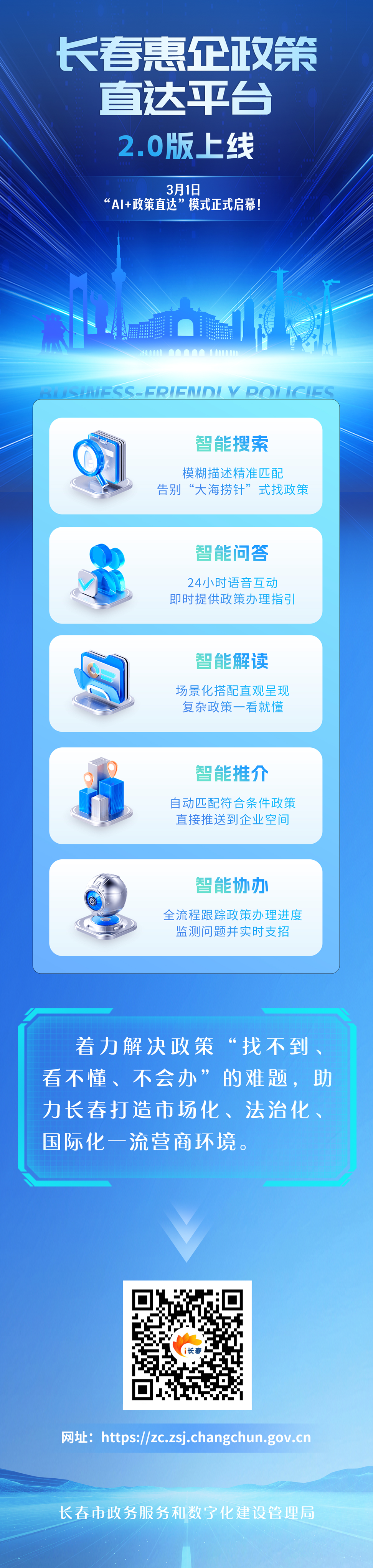 長春市政數(shù)局營商環(huán)境服務(wù)處二級調(diào)研員傅強介紹,2021年,長春惠企政策直達(dá)平臺1.0版上線。經(jīng)過五年實踐打磨完成全面升級,2.0版主打大數(shù)據(jù)+人工智能技術(shù),從企業(yè)視角打造AI應(yīng)用場景,讓企業(yè)輕松找政策、方便辦政策。