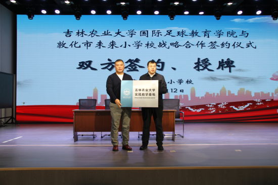 為進(jìn)一步深化高校與基礎(chǔ)教育合作,推動實踐育人協(xié)同發(fā)展。近日,吉林農(nóng)業(yè)大學(xué)國際足球教育學(xué)院校外實踐教學(xué)基地與敦化市教育局戰(zhàn)略合作簽約儀式在敦化市未來小學(xué)校舉行。教育部東北校園足球發(fā)展研究中心秘書長、吉林省學(xué)生體質(zhì)健康研究中心主任、吉林農(nóng)業(yè)大學(xué)國際足球教育學(xué)院院長張志成同志,吉林農(nóng)業(yè)大學(xué)國際足球教育學(xué)院副書記趙立剛同志及學(xué)院一行人員,敦化市教育局黨組書記、局長姬廣建同志,敦化市教育局黨組成員、教育工委專職副書記張冬輝同志,以及卓越科技有限公司代表等出席了本次活動。