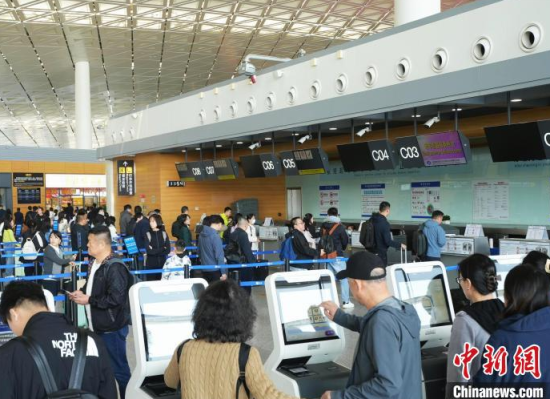 清明假期,旅客在長春龍嘉國際機(jī)場排隊(duì)值機(jī)。(吉林機(jī)場集團(tuán)供圖)
