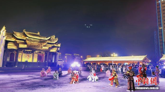 中新網(wǎng)吉林1月1日電 (記者 石洪宇)喜連成京劇藝術(shù)公園的戲臺上,千回百轉(zhuǎn)的青衣唱腔融合水袖、髯口元素,再現(xiàn)經(jīng)典國粹形象。不遠(yuǎn)處,沿松花江岸施放的煙花綻放夜空,與戲臺文藝遙相呼應(yīng)。