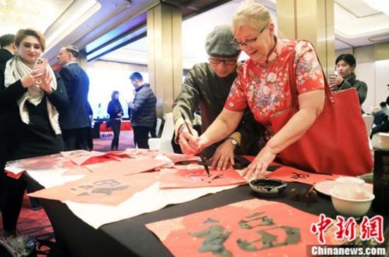 “老外講故事”俱樂(lè)部成員在學(xué)習(xí)寫(xiě)毛筆字。湯彥俊 攝