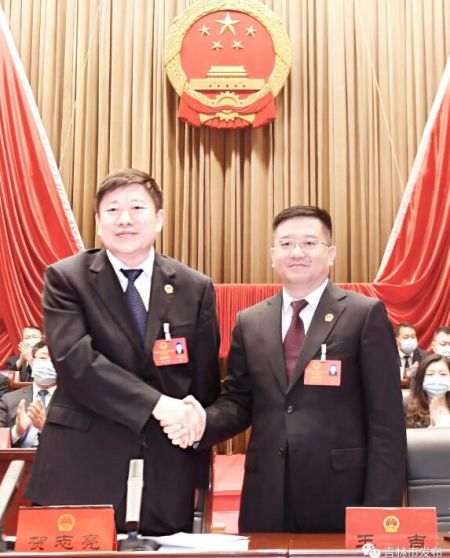 圖為市委書記賀志亮(左)和新當(dāng)選的市長王吉握手