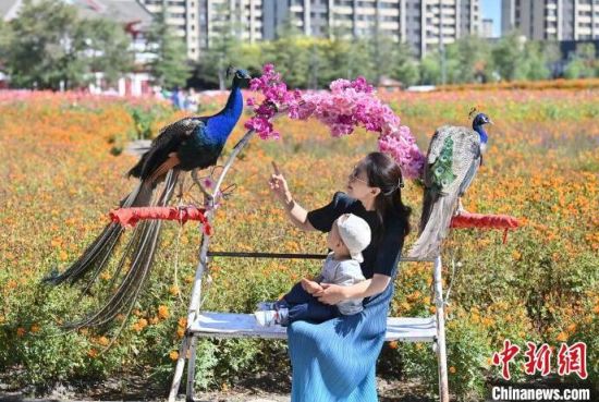 游客在花海和孔雀互動。張瑤 攝
