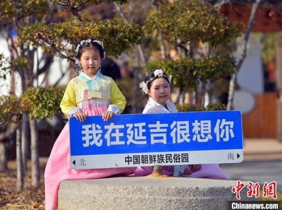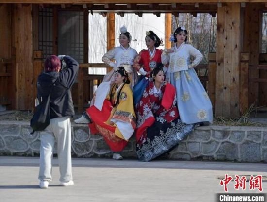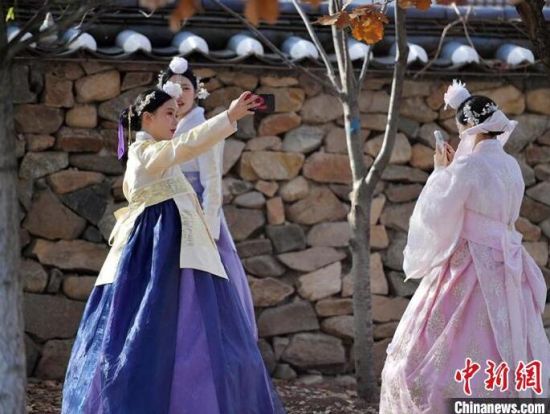 11月4日,在吉林省延邊朝鮮族自治州延吉市的中國朝鮮族民俗園內(nèi),游客身著朝鮮族服飾拍照留念。延邊是中國最大的朝鮮族聚居區(qū),濃郁的民族風(fēng)情吸引大量游客前來觀光體驗(yàn)。