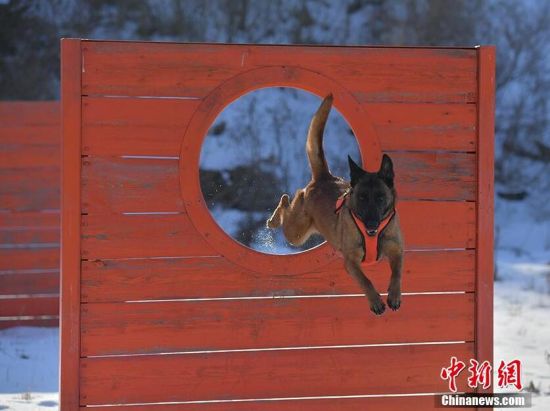 搜救犬正在進(jìn)行跳木圈訓(xùn)練。