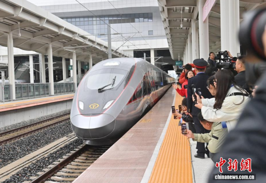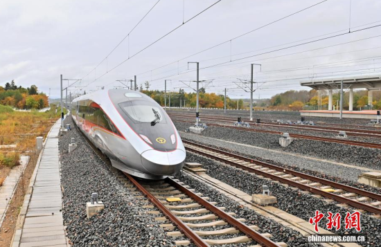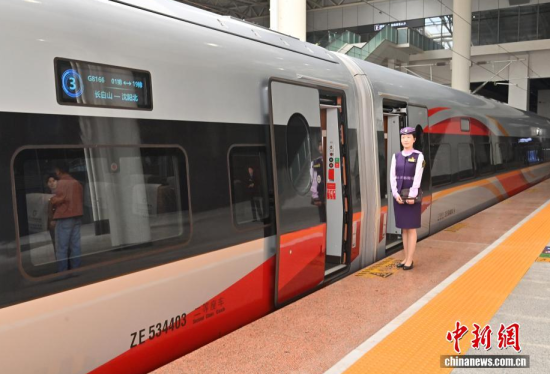 9月28日,G8166次列車從長白山站始發(fā),駛向終點站沈陽北站,沈白高鐵正式開通運(yùn)營,結(jié)束了吉林省通化、白山兩市不通高鐵的歷史,北京朝陽站、沈陽北站至長白山站的最短旅行時間分別為4小時33分、1小時53分。作為中國東北高鐵網(wǎng)重要組成部分,該線路對暢通區(qū)域經(jīng)濟(jì)循環(huán)、促進(jìn)沿線旅游資源開發(fā)等具有重要作用。中新社記者 張瑤 攝