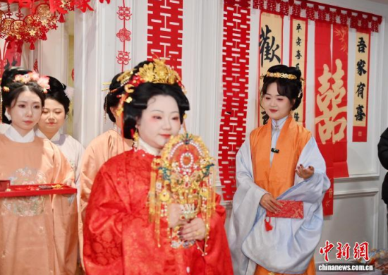 1月9日,吉林長春,任鴻洋(右)手持熏香入場。長春“00后”女孩任鴻洋是一位漢服愛好者,出于對傳統(tǒng)文化的熱愛,她成為一名執(zhí)禮喜娘。她已為50多對新人舉辦中式婚禮,通過優(yōu)雅的古典儀式,不僅推廣傳統(tǒng)婚俗,更致力于傳播漢服文化。她希望以年輕的方式,讓千年“中式浪漫”在現(xiàn)代生活中煥發(fā)新光彩。中新社記者 張瑤 攝