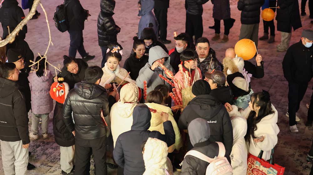 主街上人頭攢動,500個電子氦氣孔明燈正被游客陸續(xù)領走。這種無明火的環(huán)?顭羟颍缺A袅藗鹘y(tǒng)意蘊,又兼顧了綠色理念。孩子們用馬克筆在燈上寫下心愿,在巡游隊伍中歡快地奔跑。冰雕糖葫蘆、轉運祈福墻、漢服巡游……一個個精心設計的打卡點,讓整條老街成為國風出片的天然影棚。